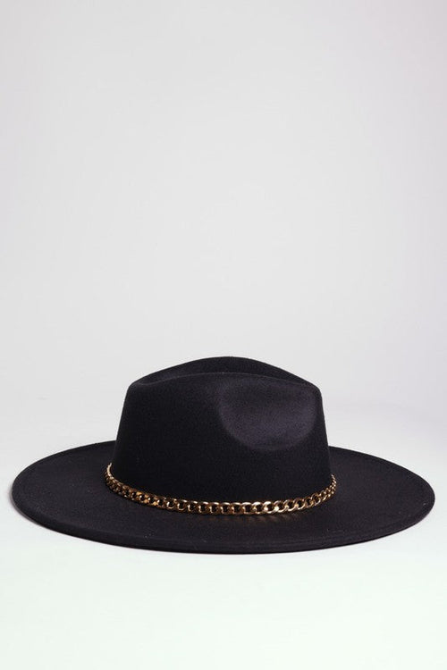 Classic Fedora hat with stylish chain. Approximate measurements: Height: 4", brim: 3.5", circumference: 47.5"Material Composition: - 100% polyester